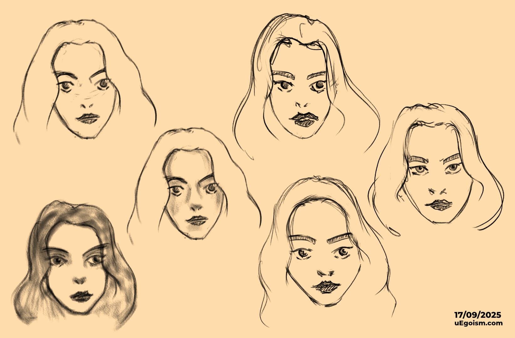Sketch Quick sketches #3 uEgoism 17 Sep 2025 • 1 min read Several sketch variations based on one reference. I also tried to create volume with a soft brush, but it didn’t work out very well :D Approximate practice time: about 1 hour.